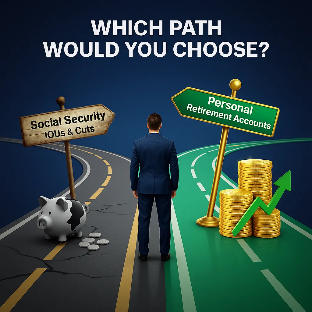 Social Security must be replaced with Personal Retirement Accounts (PRAs). Workers under 55 shift to PRAs, while those 55 and older remain fully protected under current law. PRA balances begin as credited accumulations of each worker’s FICA contributions, recorded annually and allowed to grow with wage-indexed returns. As cohorts progress, these credited balances convert into private, investable, inheritable accounts. FICA continues to fund legacy retirees while the old system winds down, enabling a solvent, property-based retirement structure without borrowing or benefit cuts.