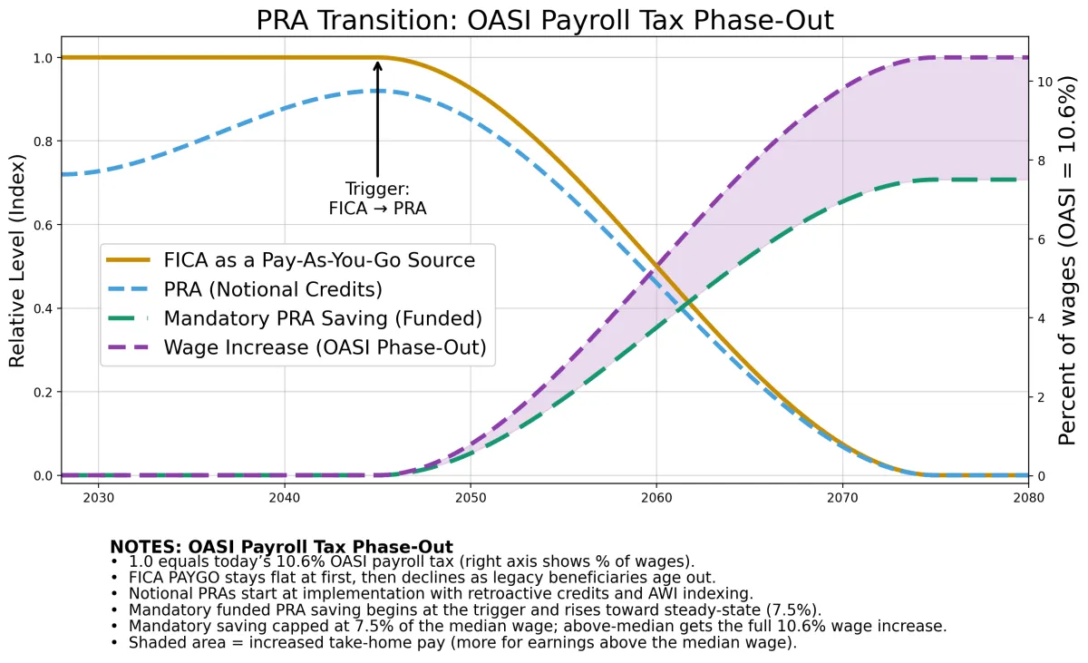 The PRA Plan transitions Social Security to a system of individually owned, inheritable accounts that grow with wages. Workers under 55 receive retroactive credits and build PRA balances that yield higher benefits and greater flexibility than today’s system. As legacy retirees decline, FICA gradually converts into mandatory PRA contributions, ultimately creating a fully private, property-based retirement system with rising take-home pay.