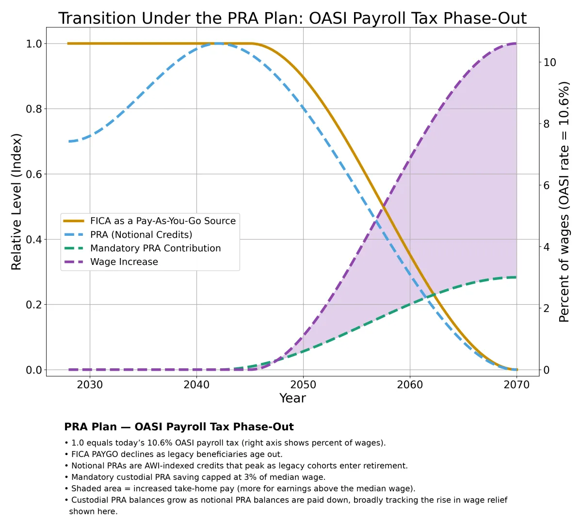 When approximately 95 percent of remaining beneficiaries are PRA retirees and the legacy system has contracted to a small, predictable residual, the reduced FICA stream is redirected into private custodial PRAs. The payroll mechanism remains unchanged; only the destination changes. The default mandatory PRA contribution is about 3 percent of earnings, capped at median wages. Workers may voluntarily contribute more, and employers may offer matching contributions.
